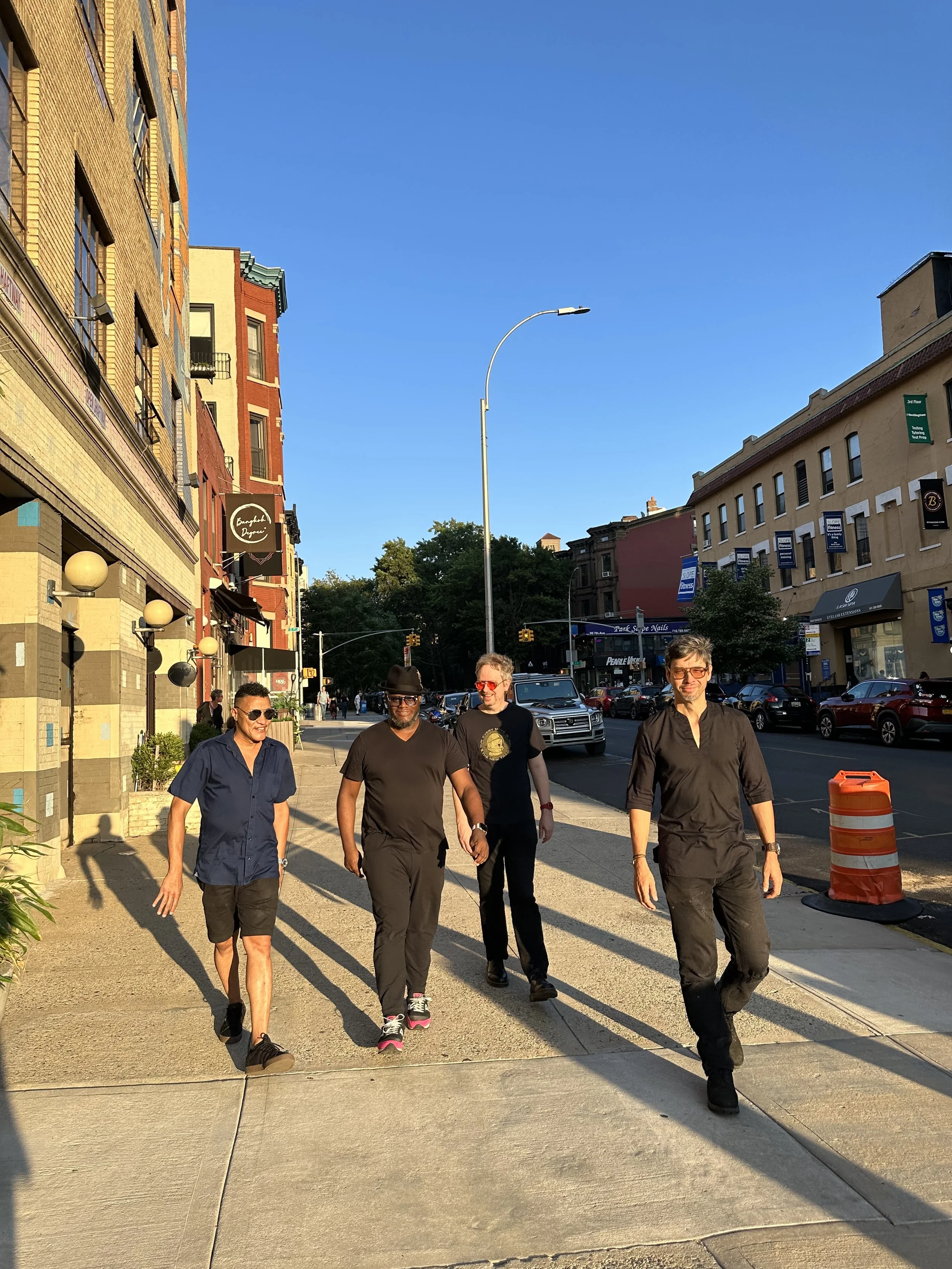In June of 2022, Trickster played for three weeks at SEEDS, a small venue in Prospect Heights, Brooklyn. To get into the frame of mind for this recording you might imagine the scene as you arrive in the neighborhood. You walk down a typical street full of brownstones and shops, seeing people hanging around everywhere on stoops and curbs trying to beat the early evening heat. After some looking, you hear music coming from behind a glass storefront door thatʼs ajar. A young fellow invites you in and you step into a room about as big as a two-car garage, finding a spot in the crowd of people sweating it out in the company of four musicians lined up on a brick wall, clearly working hard but having a good time.